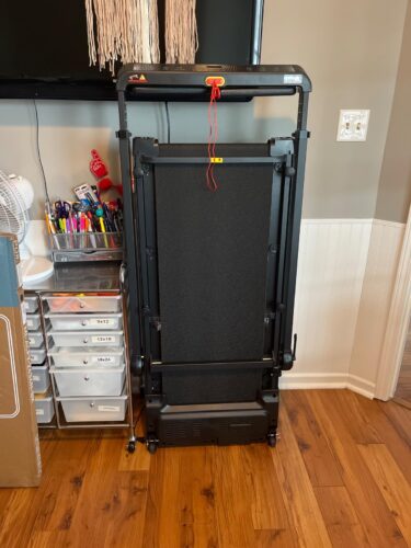 One of the selling points of any of the walking pads is the low profile and ability to slide it under your couch or bed. This did not fit under my couch, but I do have IKEA furniture, so it’s pretty small and low to the ground. Your mileage may vary. What I do like is that you can very easily store this upright without taking up much room. This is how I store mine when not in use and it gets it out of the way and out of sight!