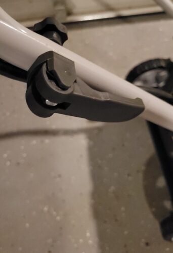 4) Black plastic handled spring mounted pull clips with steel pins make storing the mower vertically convenient, as well as, giving sturdy access to sharpen and clean as needed. (The three position handle adjustment plate has a fourth set of holes in it that transforms this steel bracket into the mower's vertical kickstand. Pre and post maintence is a snap for me, because of this feature.
