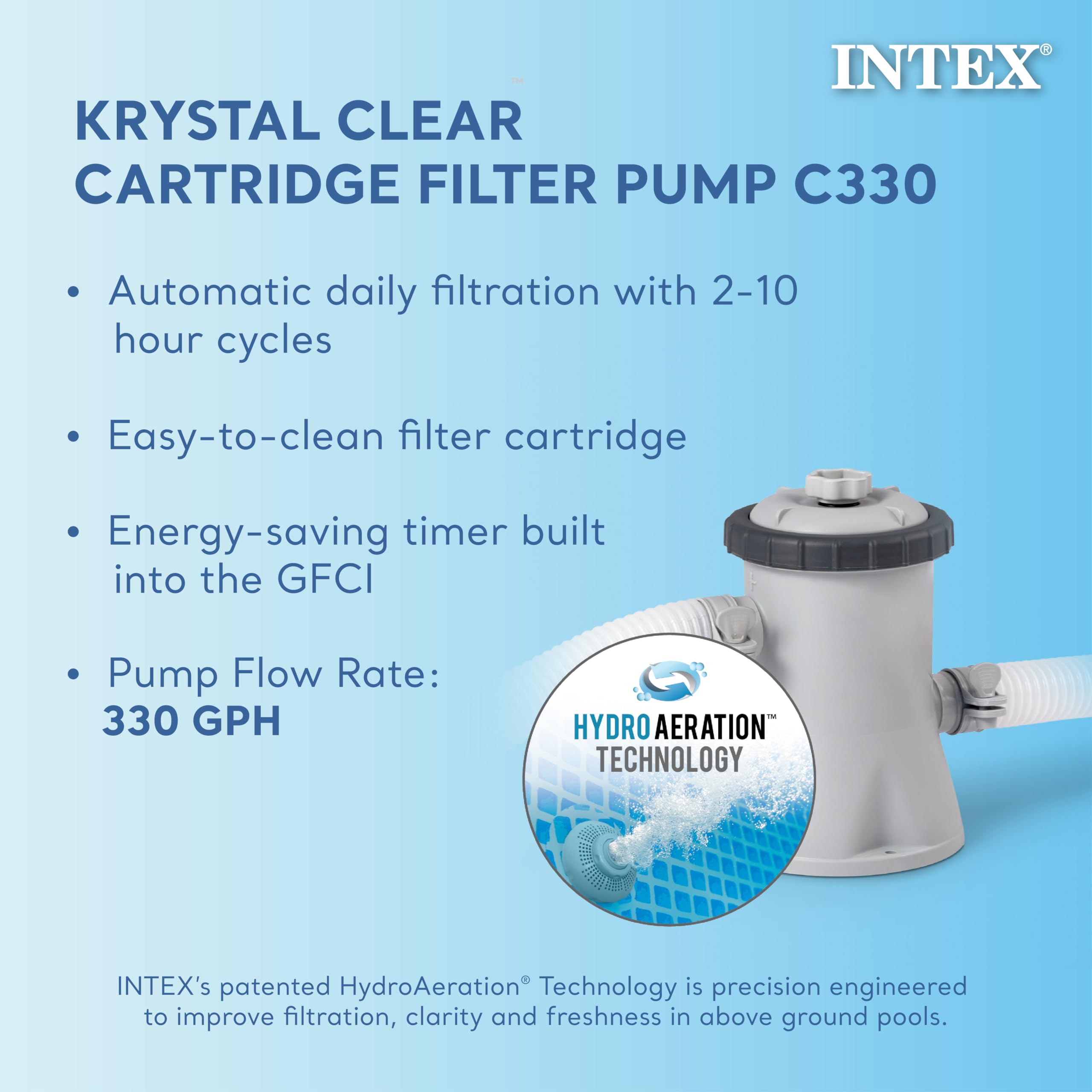 - Efficient Filtration: 1,000 GPH (3,785 L/h) Krystal Clear™ filter pump with HydroAeration® Technology