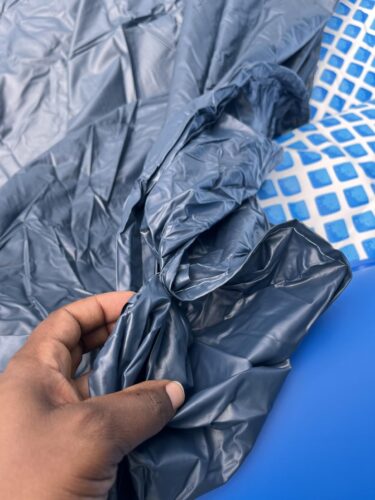 Put it on level ground, though. They are so not kidding about that. It is worth it to crawl around on the ground with a level and double check before you put it down and fill it up--every inch of incline will reduce the total depth of the Swimming Sack by an inch. (or maybe more, I don't know--I come home from work and have a beer in a hundred dollar pool, I am clearly NOT in a STEM field of any kind.) And since you're not working with a lot of depth to begin with, those two inches count. It also helps if you hang out in the sack while you're filling it up so you can help smooth out any wrinkles on the bottom as you fill it. Because if you wait until it's all full and then try to smooth them out, good luck with all that, it's not going to work.