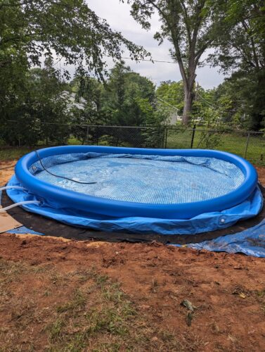 The most crucial aspect of setting up this pool is ensuring that the ground is level. It took three days for my husband, a friend, and me to get it properly leveled, especially when dealing with our rugged NC devil’s dirt. I learned that it’s essential to pay attention to the water flow when filling the pool – if the water is consistently flowing to one side, it’s a sign that thee pool is not level. Ignoring this could cause the pool to lean to one side when filled, as shown in the pictures.
