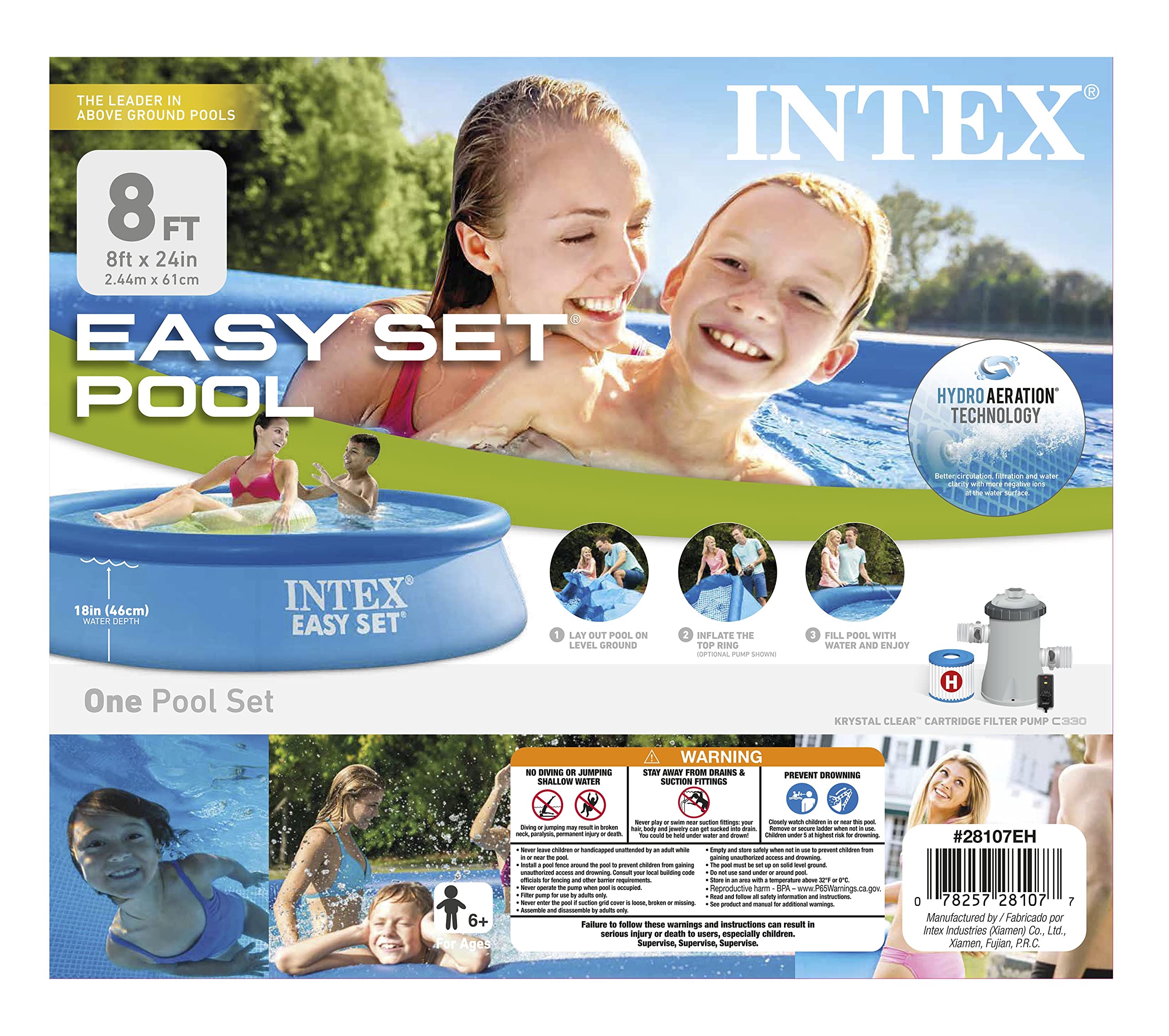 We bought the 12 foot version in May of 2016. It's worked great so far. It took about an hour to setup. I used a tarp underneath which Intex does not recommend, but we did it anyway to protect the bottom. It took about 3-4 hours to fill up the pool. This one comes with the pump and filter setup which is a must to keep the water clean. We also bought some basic pool chemicals, and both available covers by Intex. The cover we use the most is the solar cover. Where we live its around 90-100 degrees F daily. You should also have a strainer for this pool to get the leaves and larger organic matter out of the pool. The included pump/filter setup is really just the get the stuff the strainer can't get.
