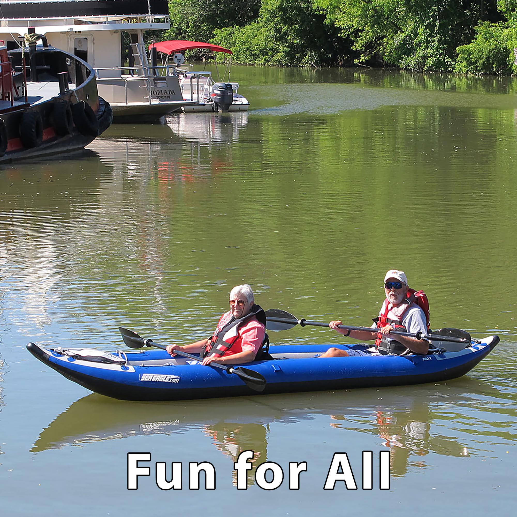 About the 380x Explorer Inflatable Kayak Tackle your adventures in this rugged solo or tandem tough as nails inflatable kayak! The 380x is made to be ridden by one or two persons. Now you can do what others only dream of with our most versatile inflatable kayak series ever! Rugged design to tackle whitewater, open-water, and now down-wind sailing! Large enough for two but small enough for one! The 380x does it all! Great wet or dry boats – they are tough enough for class four whitewater, but stable, dry and comfortable on flat-water as well. Super-fast self-bailing with 16 floor drains that can be left open for wet whitewater and ocean kayaking or closed for high and dry flat-water paddling. The Explorers also feature a removable slide skeg for improved tracking on open water. Pound for pound these Explorers are champions capable of handling any type of adventure: Fishing, Touring, Camping, Exploring, Adventuring, Whitewater, but Never Boring!